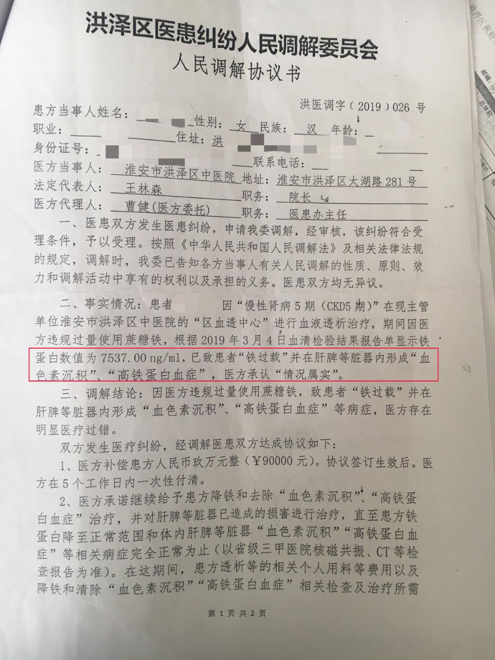 洪泽区中医院与患者签订的第一批协议,承认”因蔗糖铁纠正肾性贫血“,致铁过载,补偿1万元。