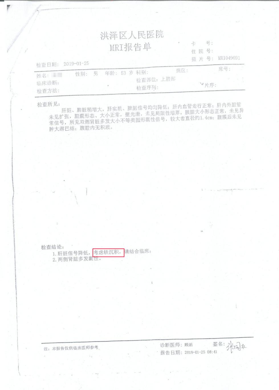江苏洪泽至少有37名血透患者,在洪泽区中医院“过量补铁”,铁蛋白水平超出4-13倍(以铁蛋白水平500ug/L为基数)不等。其中,2名患者被确诊“肝硬化”。