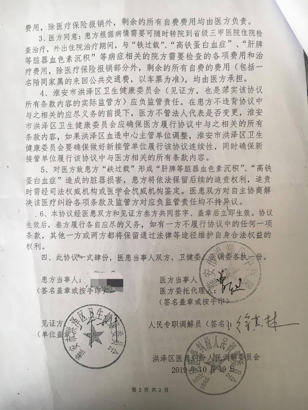 不到一个月的时间,洪泽区中医院与大部分患者迅速签署协议,现金补偿数万元,同时免费进行“去铁治疗”(期间透析同样免费)。