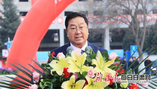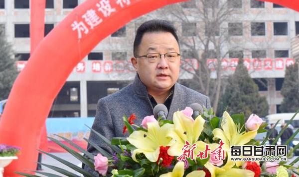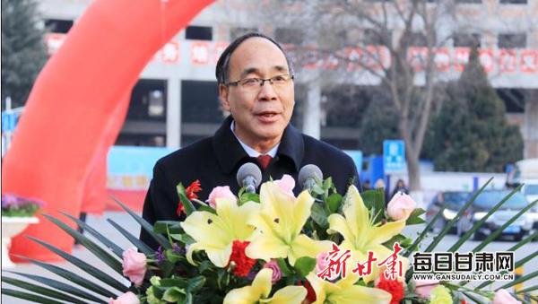 贾宁宣读《甘肃省人民政府办公厅关于组建甘肃政法大学的通知》。