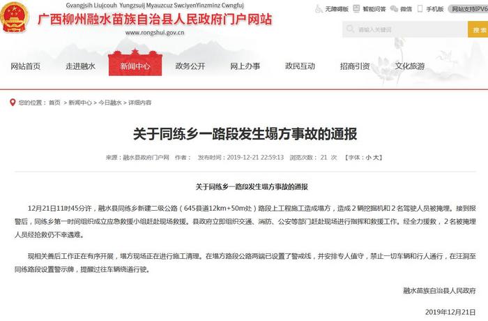 中新网12月22日电 据广西柳州融水苗族自治县人民政府网站消息,12月21日11时45分许,融水县同练乡新建二级公路(645县道12km+50m处)路段上工程施工造成塌方,造成2辆挖掘机和2名驾驶人员被掩埋。经全力援救,2名被掩埋人员经抢救仍不幸遇难。