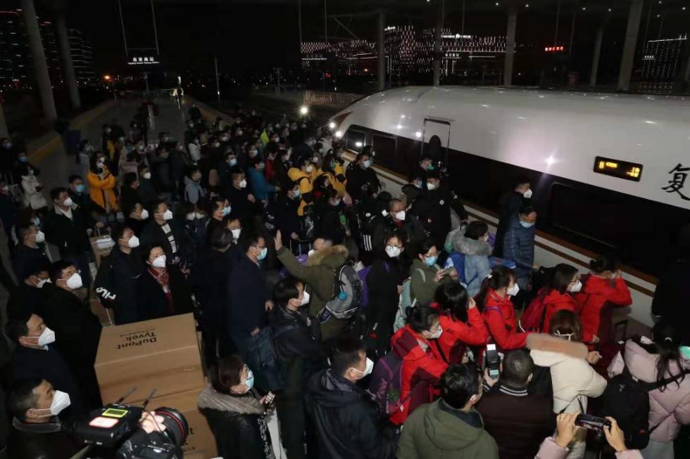 18点50分,江苏首批赴武汉支援的医疗团队队员陆续上车。