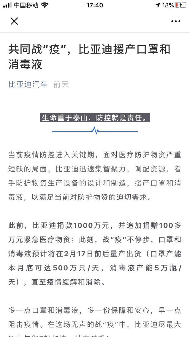 2月8日,“比亚迪汽车”微信号一篇《共同战“疫”,比亚迪援产口罩和消毒液》引发网友关注,文章称,比亚迪将在2月17日前后预计量产出货口罩和消毒液(口罩产能本月底可达500万只/天,消毒液产能5万瓶/天),直至疫情缓解和消除。