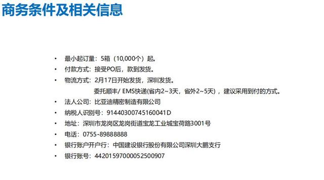 与此同时,《比亚迪卖口罩了》pdf文件也在网上流传,文件内容显示,口罩制造的法人公司为比亚迪精密制造有限公司,最小起订量为5箱(10000个)起,2月17日开始从深圳发货。快递委托顺丰/ EMS快递(省内2-3天,省外2-5天) 。
