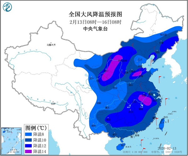 受强冷空气影响,2月13日夜间至2月16日,我国中东部大部地区将先后降温8~10℃,其中吉林东部、内蒙古西部、西北地区东部、华北南部、江汉东部、江淮西部、江南中西部、华南北部等地的部分地区降温可达12~14℃。14日起最低温度0℃线将从华北地区逐步南移,2月17日最低温度0℃线将南压到江南南部。长江中下游及以北地区将先后出现4~6级偏北风;东部和南部海区有6~8级、阵风9级的大风。