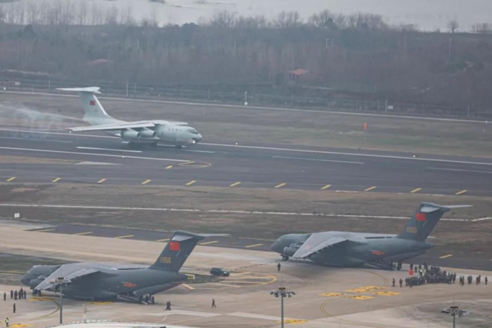 按照中央军委命令,13日凌晨,空军出动运-20、伊尔-76、运-9共3型11架运输机,分别从乌鲁木齐、沈阳、西宁、天津、张家口、成都、重庆7地机场起飞,向武汉空运军队支援湖北医疗队队员和物资。