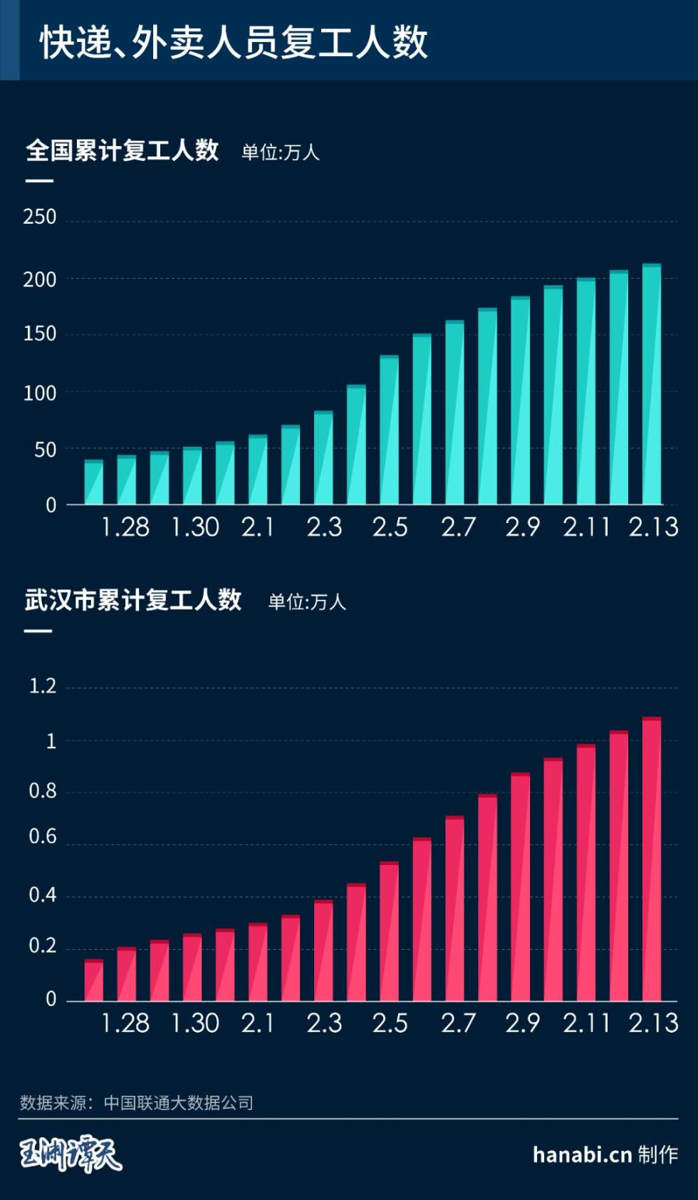 中国联通大数据公司依托13.5亿条手机信令日志数据和103亿条互联网日志数据,分析得出:快递人员和外卖人员成了复工先行者。