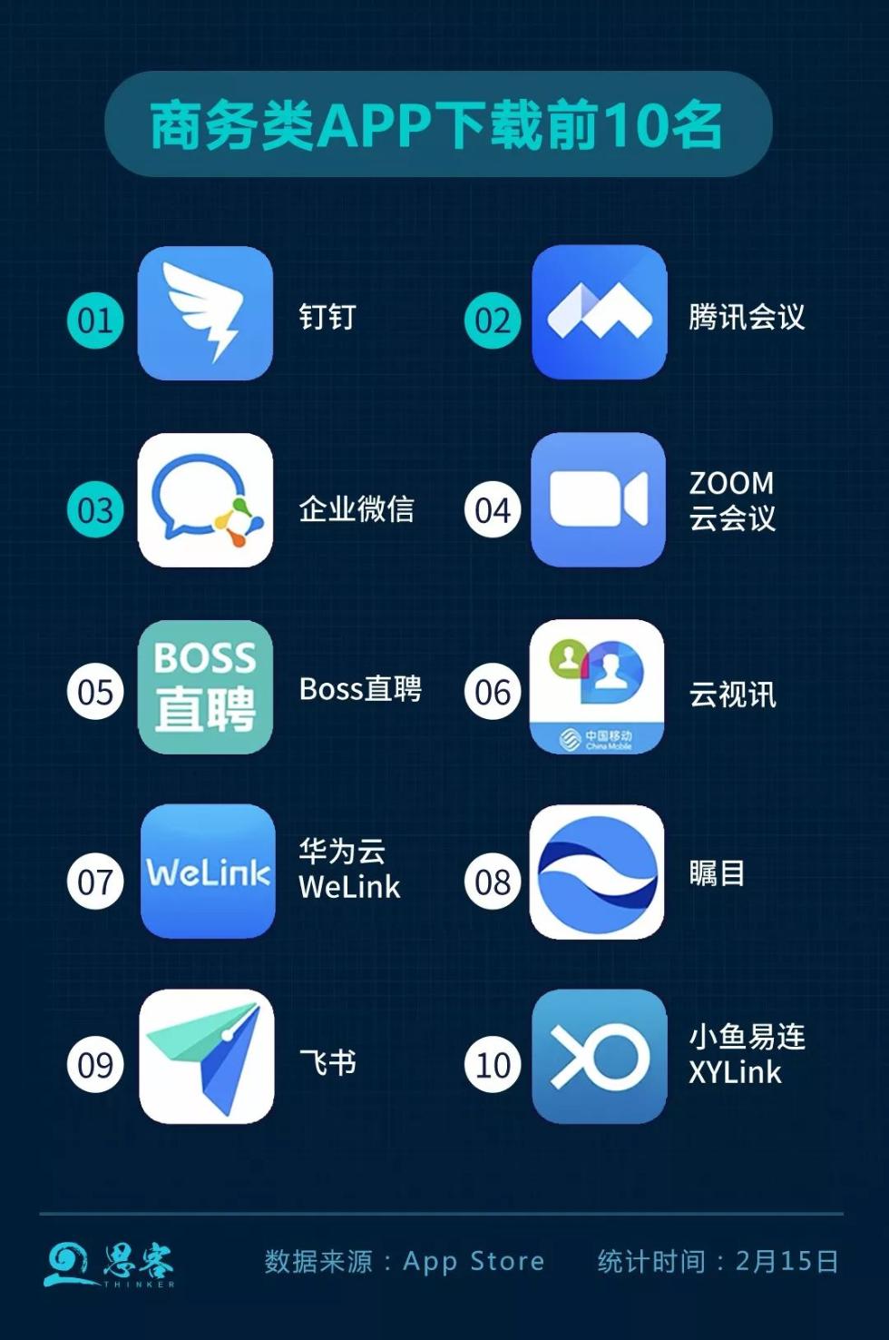 为了避免人群聚集,不少企业也选择“云复工”。近日,手机应用商店商务类下载前10位的应用中,有9个是在线办公或在线会议软件,在线办公软件钉钉也超越微信,跃居免费下载排行榜第一位。据钉钉统计,开工几天内,约有2亿人在该平台办公。经过这段时间的实践,不少企业开始考虑将远程办公变为常态,将节省下来的房租费用投入生产。