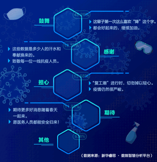 这些数据的变化,向社会传递出积极信号,也触动着网民的心绪。据新华睿思数据显示,近五成的网民表示这些变化的数字令人“备受鼓舞”,“这辈子第一次这么喜欢‘降’这个字”。同时,网民表示,这些好消息是一线抗“疫”人员用奉献和汗水换来的,我们唯有支持和珍惜。