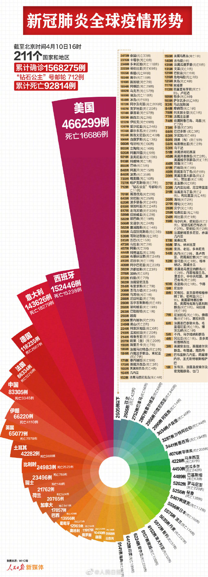 人民日报微博4月10日消息,全球累计新冠肺炎超156万例。截至北京时间4月10日16时,疫情已扩散至全球211个国家和地区,累计确诊1568275例,“钻石公主”号邮轮712例,累计死亡92814例。美国累计确诊466299例。