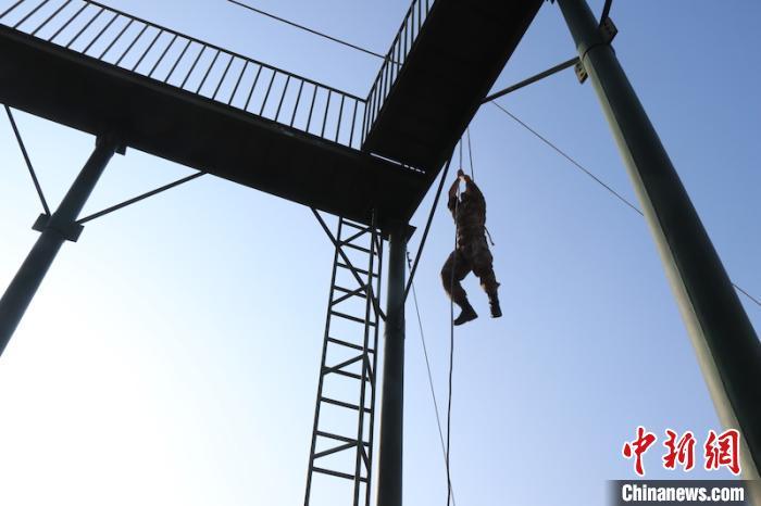 刚完成武装攀登的他还没来得及喘口气,又马不停蹄投入到牵引横越考核中。扣环、上绳、抓稳、攀爬……指挥下达口令后,只见他迅速调整状态。“准备,上!”不一会儿,张宗斌如猎豹般迅速到达终点。
