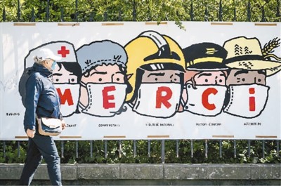 图为4月14日,在法国巴黎,一名男子走过一幅向疫情期间辛苦付出的人们致谢的海报。 奥雷利安·莫里萨尔摄(新华社发)