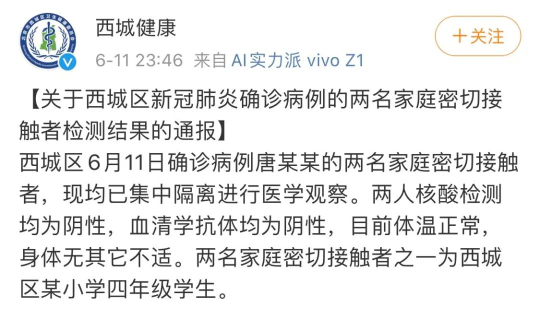 西城区卫健委官方微博“西城健康”刚刚发布消息:西城区6月11日确诊病例唐某某的两名家庭密切接触者,现均已集中隔离进行医学观察。两人核酸检测均为阴性,血清学抗体均为阴性,目前体温正常,身体无其它不适。两名家庭密切接触者之一为西城区某小学四年级学生。