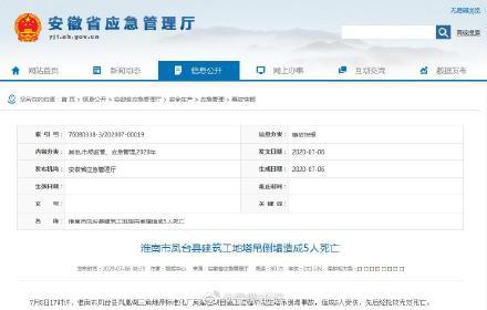 人民网合肥7月6日据安徽省应急管理厅消息,7月5日17时许,淮南市凤台县凤凰湖三角地带标准化厂房建设项目施工过程中发生塔吊倒塌事故,造成5人受伤,先后经抢救无效死亡。