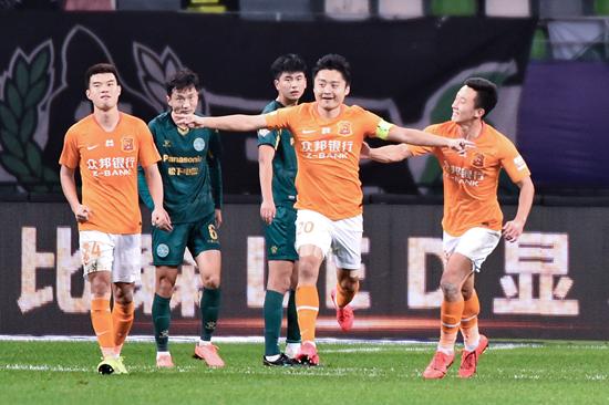 11月22日,在江苏苏州进行的2020赛季中国足球协会超甲升降级附加赛次回合比赛中,武汉卓尔队击败浙江能源绿城队保级成功。图为武汉卓尔队球员李行(右二)在比赛中主罚点球破门后庆祝。新华社发 史康/摄