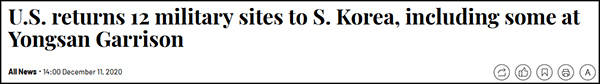 据韩联社统计,归还的12座美军基地总面积约为146.5万平方米。