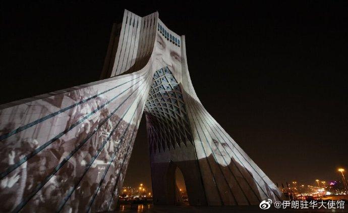 这条微博的三张配图包括苏莱曼尼的照片、伊朗首都德黑兰举行的苏莱曼尼遇难周年悼念活动上拍摄的地标建筑自由塔,以及被投射到自由塔上的苏莱曼尼头像。其中苏莱曼尼的照片配图中也特意标注了“03.01.2020 01:20 a.m.”。