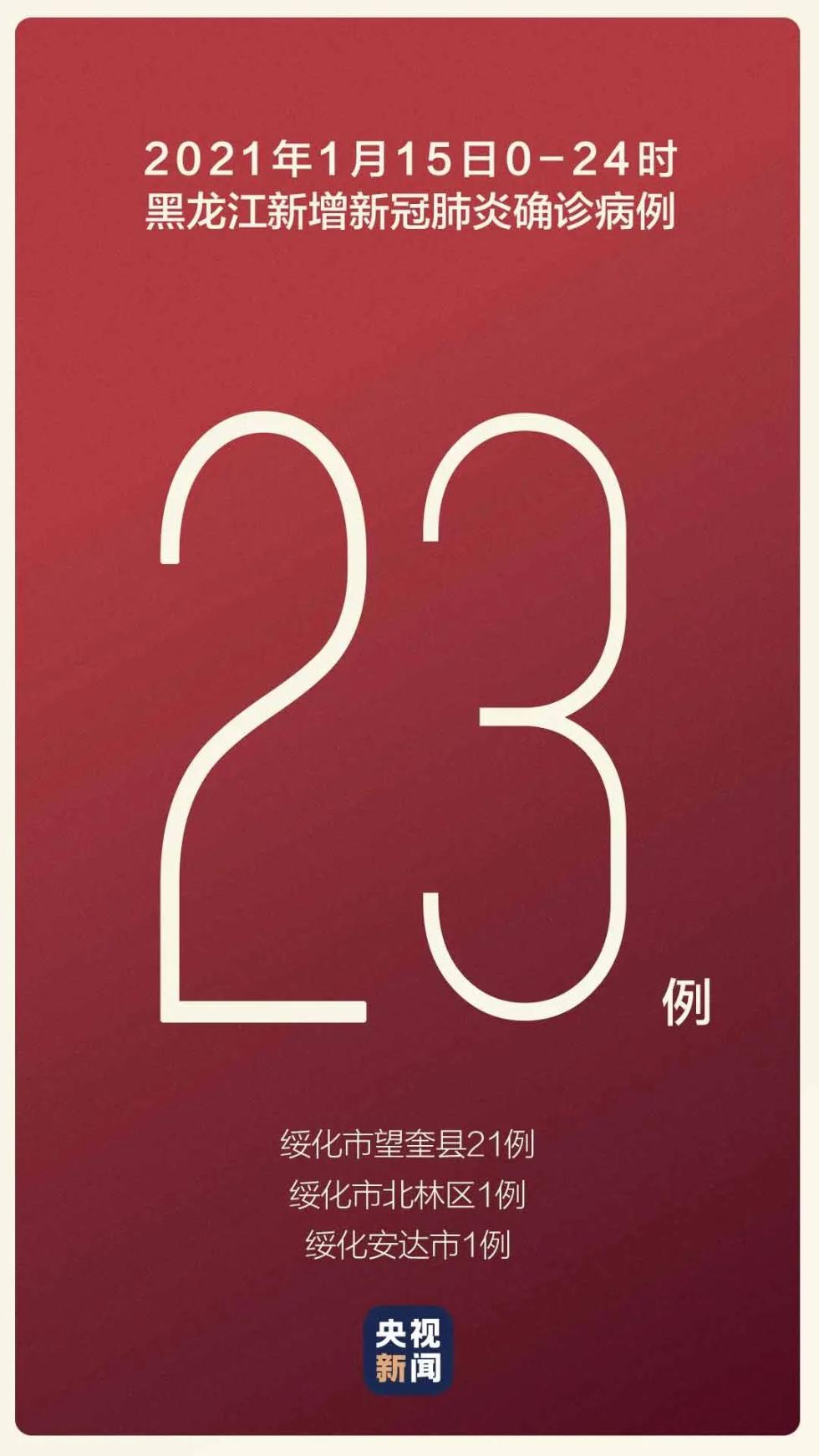 据黑龙江省卫健委消息,15日0时至24时,黑龙江省新增23例新冠肺炎确诊病例(绥化市望奎县21例,其中7例为望奎县无症状感染者转为确诊病例,绥化市北林区1例,绥化安达市1例);新增无症状感染者30例(绥化市望奎县25例,绥化市绥棱县2例,绥化安达市2例,哈尔滨市道外区1例)。