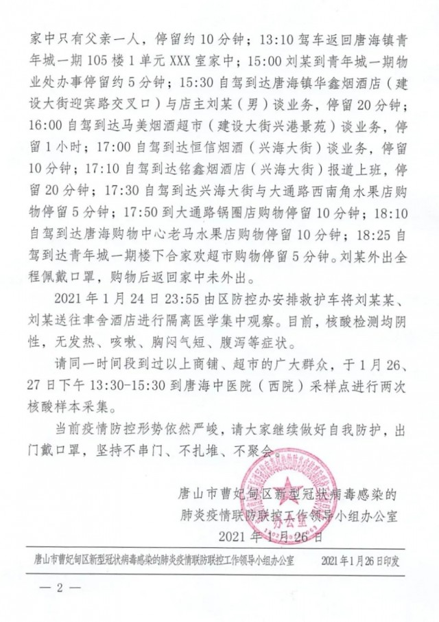 广大居民:2021年1月25日,海港开发区接到唐山市疾控中心协查函通报,陈某曾于1月16日到唐山市人民购物超市购买涉疫食品,并于1月24晚17:45-21:00在海港开发区王滩镇盛炎活羊馆用餐,与陈某密切接触的盛炎活羊馆服务员姚某于2021年1月24日21:10-22:30在王滩镇曙光浴池洗澡,现寻找1月24日17:45-1月25日20:00在王滩镇盛炎活羊馆用餐人员及24日21:10-22:30曙光浴池洗澡人员,请上述人员速与属地乡镇(街道)或工作单位报告,立即居家不得外出,配合属地落实下一步管控措施。