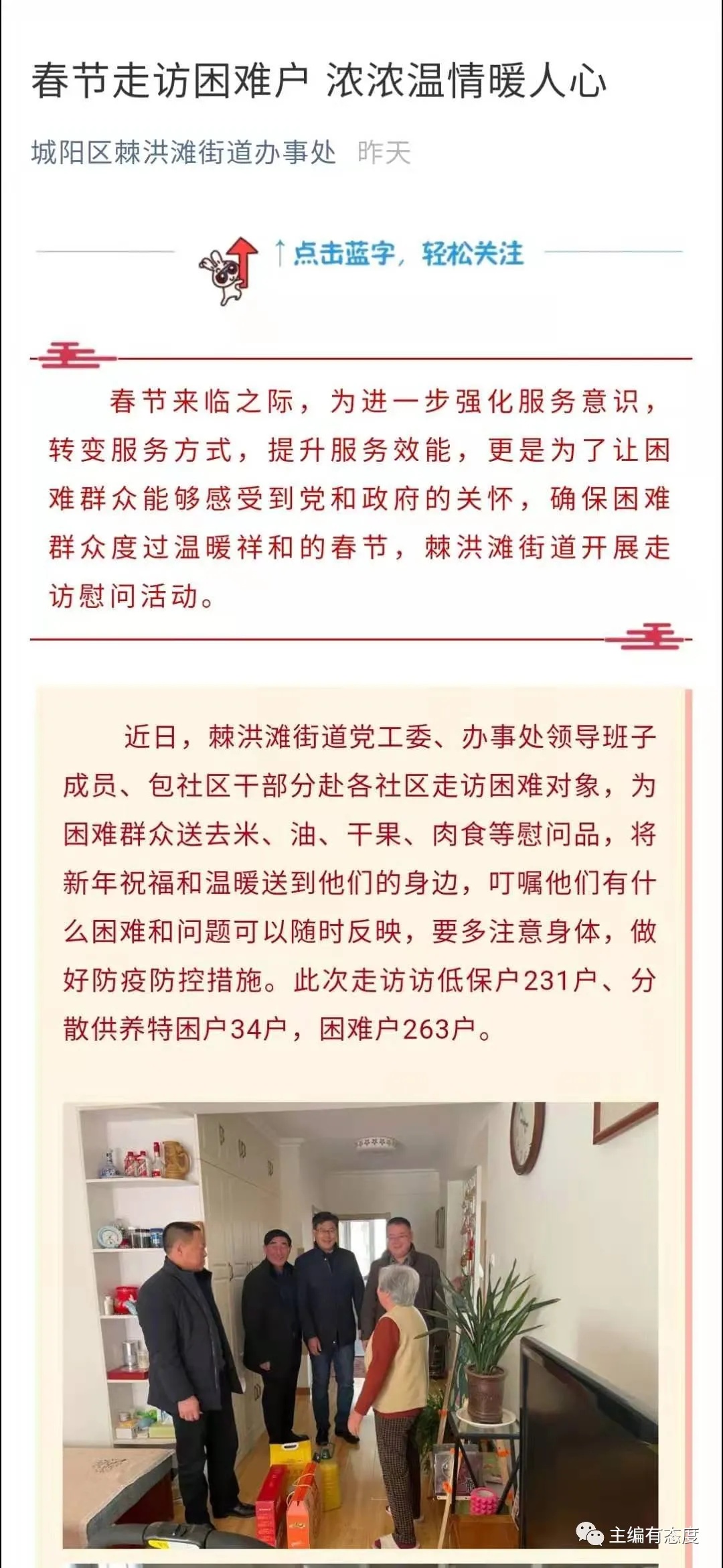 2月3日,青岛市城阳区棘洪滩街道微信公众号发布题为《春节走访困难户浓浓温情暖人心》的文章,文中被走访慰问人员家里带有高档酒瓶的配图引发部分网民质疑。城阳区委、区政府对此高度重视,区纪委监委和区民政局已于2月4日组成调查组进行调查,调查结果将尽快对社会公布。