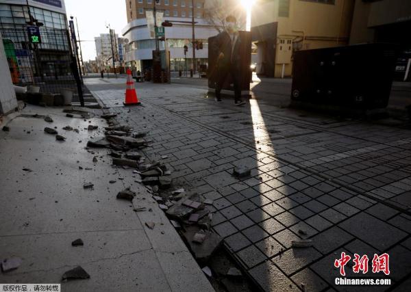 当地时间2月14日,日本福岛县磐城市,一座建筑物的外墙因强烈地震而倒塌,碎片散落一地。