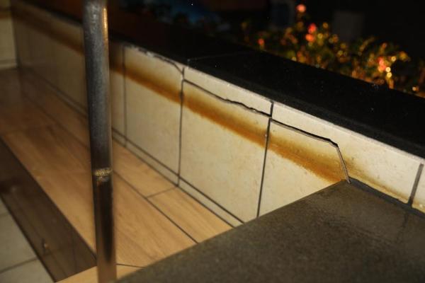这是2月15日在日本福岛县相马郡拍摄的韩秋月的温泉酒店的天然温泉池,地震后池壁瓷砖开裂,天然温泉池暂停服务。新华社记者 杜潇逸 摄