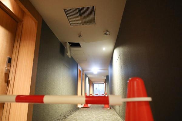 这是2月15日在日本福岛县相马郡拍摄的韩秋月经营的酒店内部,部分天花板出现裂痕,已隔离禁止通行。新华社记者 杜潇逸 摄