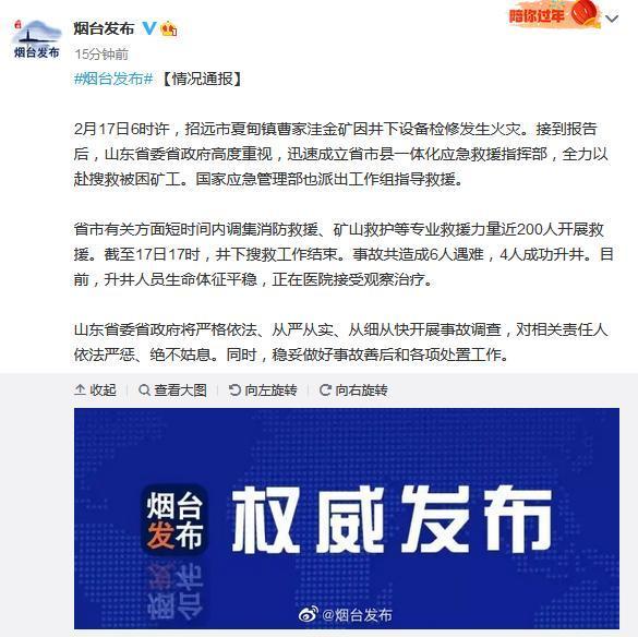中新网2月17日电 据山东省烟台市政府新闻办官方微博消息,2月17日6时许,招远市夏甸镇曹家洼金矿因井下设备检修发生火灾。接到火灾报告后,山东省委省政府高度重视,迅速成立省市县一体化应急救援指挥部,全力以赴搜救被困矿工。国家应急管理部也派出工作组指导救援。