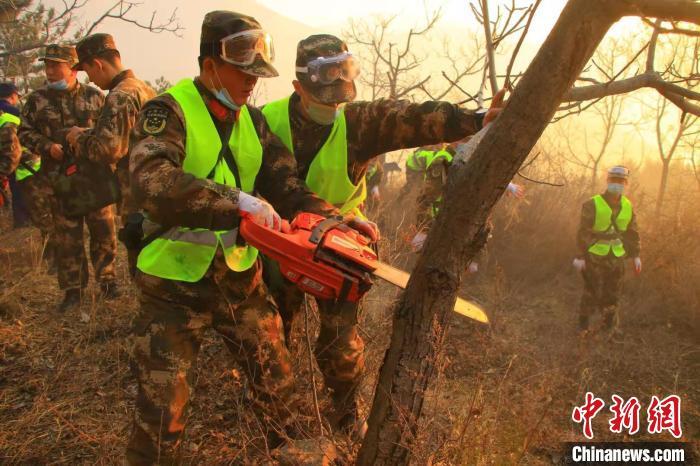 武警官兵抢挖防火隔离带。 翟飞飞 摄