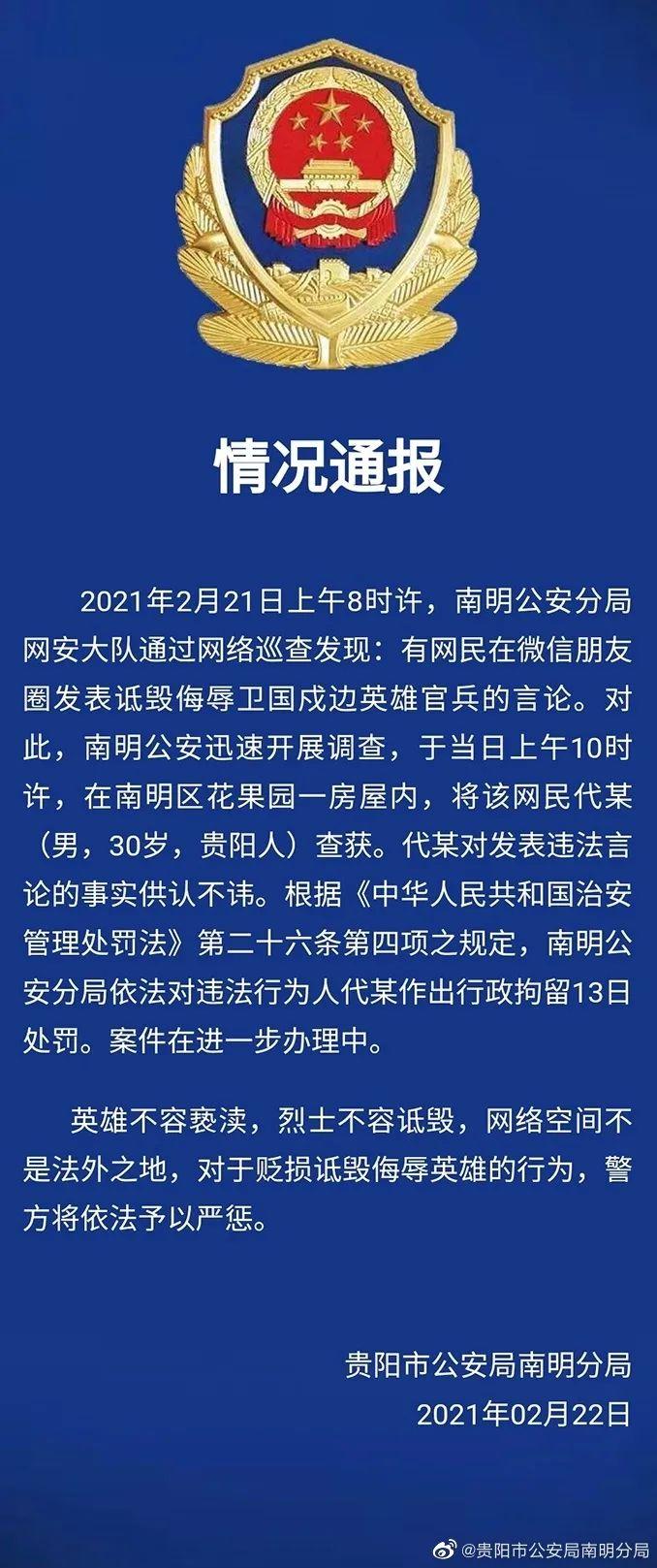 2021年2月21日上午8时许,南明公安分局网安大队通过网络巡查发现:有网民在微信朋友圈发表诋毁侮辱卫国戍边英雄官兵的言论。 对此,南明公安迅速开展调查,于当日上午10时许,在南明区花果园一房屋内,将该网民代某(男,30岁,贵阳人)查获。代某对发表违法言论的事实供认不讳。根据《中华人民共和国治安管理处罚法》第二十六条第四项之规定,南明公安分局依法对违法行为人代某作出行政拘留13日处罚 。案件在进一步办理中。