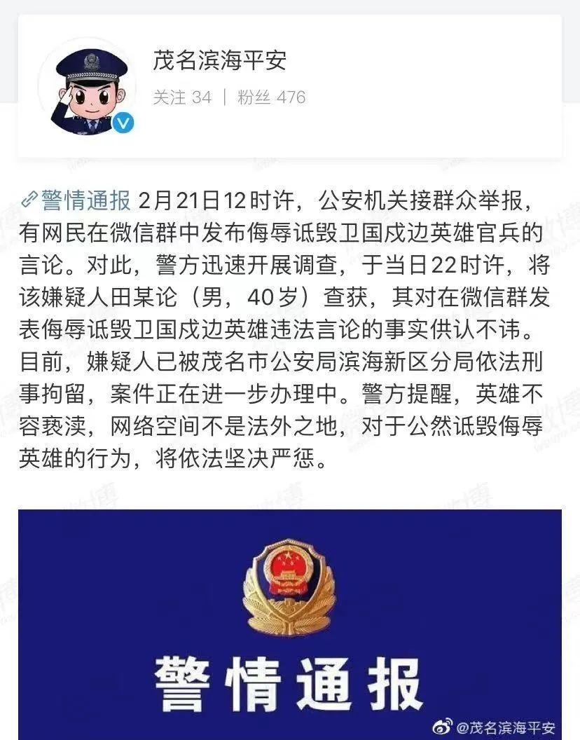 2月21日12时许,公安机关接群众举报,有网民在微信群中发布侮辱诋毁卫国戍边英雄官兵的言论。 对此,警方迅速开展调查,于当日22时许,将该嫌疑人田某论(男,40岁)查获,其对在微信群发表侮辱诋毁卫国戍边英雄违法言论的事实供认不讳。目前,嫌疑人已被茂名市公安局滨海新区分局依法刑事拘留 ,案件正在进一步办理中。警方提醒,英雄不容亵渎,网络空间不是法外之地,对于公然诋毁侮辱英雄的行为,将依法坚决严惩。