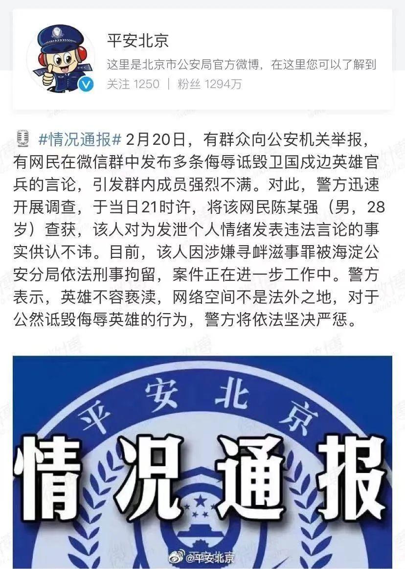 2月20日,有群众向公安机关举报,有网民在微信群中发布多条侮辱诋毁卫国戍边英雄官兵的言论 ,引发群内成员强烈不满。对此,警方迅速开展调查,于当日21时许,将该网民陈某强(男,28岁)查获,该人对为发泄个人情绪发表违法言论的事实供认不讳。目前,该人因涉嫌寻衅滋事罪被海淀公安分局依法刑事拘留 ,案件正在进一步工作中。