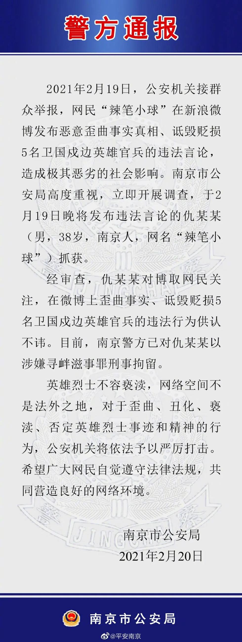 2月19日,公安机关接群众举报,网民“辣笔小球”在新浪微博发布恶意歪曲事实真相、诋毁贬损5名卫国戍边英雄官兵的违法言论,造成极其恶劣的社会影响。南京市公安局高度重视,立即开展调查,于2月19日晚将发布违法言论的仇某某(男,38岁,南京人,网名“辣笔小球”)抓获。