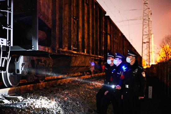 2021年春运期间,秦皇岛铁路公安处民警对大秦线货物列车加强安全检查,特别是加强夜间巡视,全力保障电煤运输大动脉的治安安全。周瑒 孙翰林/摄