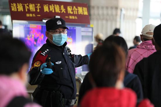 2021年春运期间,北京西站派出所民警在一楼大厅维护旅客进站秩序。张婷/摄