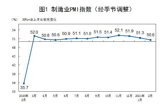 中新网2月28日电 国家统计局28日公布2021年2月中国采购经理指数运行情况,2月份,中国制造业采购经理指数(PMI)为50.6%,低于上月0.7个百分点,连续12个月位于临界点以上,制造业景气水平较上月有所回落。