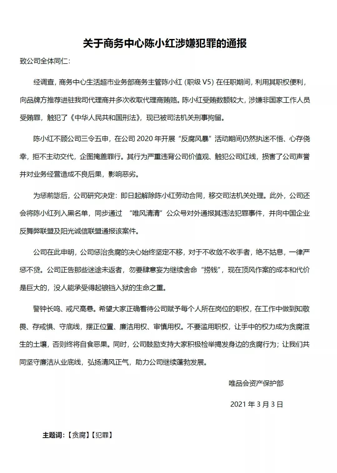 微信公众号上发布关于唯品会商务中心陈小红涉嫌犯罪的通报。