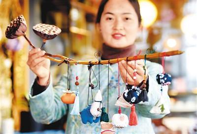 2021年2月25日,江苏省扬州市邗江区方巷镇沿湖村“渔三代”渔娘潘兰兰变身为时尚创客,正在展示蕴含渔村生态元素的挂件文创作品。