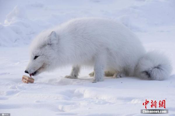 当地时间3月8日,俄罗斯科米共和国沃尔库塔小城,北极狐在雪地中吃火车站乘客扔下的蛋糕。据悉,当地野生动物正经历着由于极端寒冷天气而导致的食物危机。图片来源:ICphoto