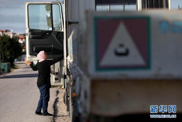 3月7日,49岁的巴勒斯坦妇女莉娜·穆萨弗在约旦河西岸城市图勒凯尔姆驾驶拖挂货车。新华社发(艾曼·诺巴尼摄)