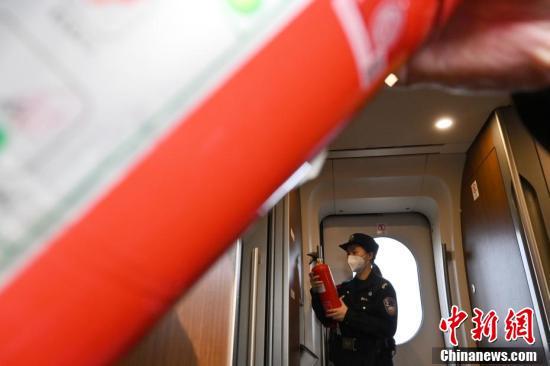 3月8日,国际妇女节。当日下午,北京铁路公安局石家庄乘警支队“95后”女乘警赵凌月正在一辆复兴号列车上忙碌,这也是她在列车上度过的第一个“三八节”。图为赵凌月检查列车上的消防设备。