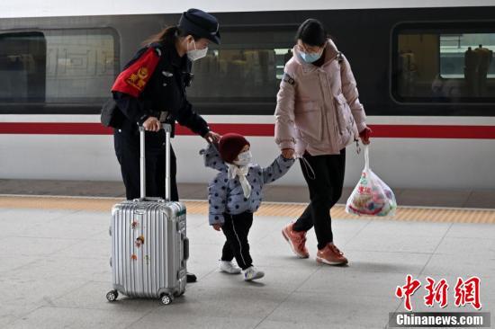 3月8日,国际妇女节。当日下午,北京铁路公安局石家庄乘警支队“95后”女乘警赵凌月正在一辆复兴号列车上忙碌,这也是她在列车上度过的第一个“三八节”。图为赵凌月协助一对母女下车。
