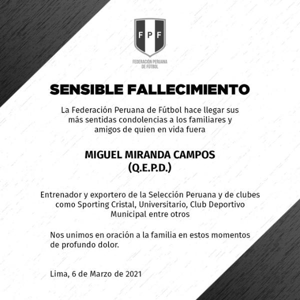 秘鲁足协为米兰达发布讣告。图片来源:秘鲁足协官方社交媒体