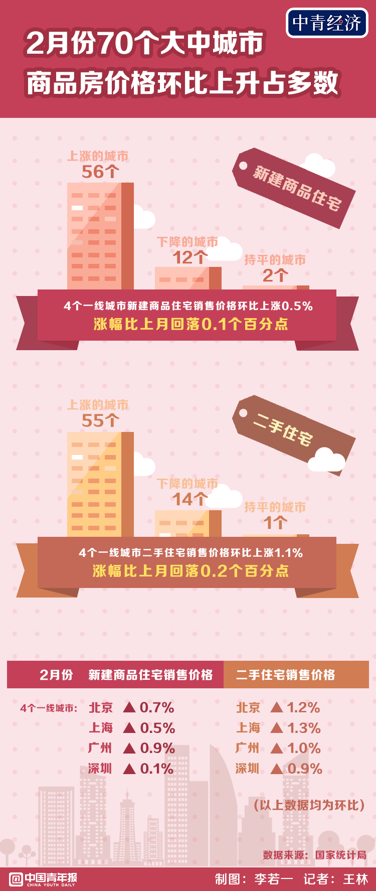 中青报·中青网记者梳理国家统计局发布的数据发现,2月份70个大中城市商品房价格环比上升的城市有56个,占大多数。