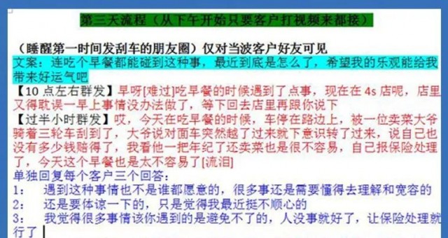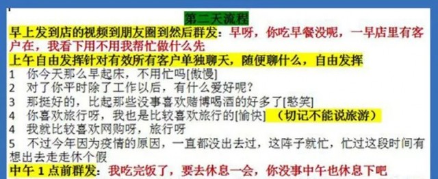脚本内容十分详细,对很多细节作出了区分。骗子会用红色来标记群发内容,蓝色来标记回复客户(目标受害者)的内容,并用黄底来标明重点,还明确区分回复时的表情和语气。