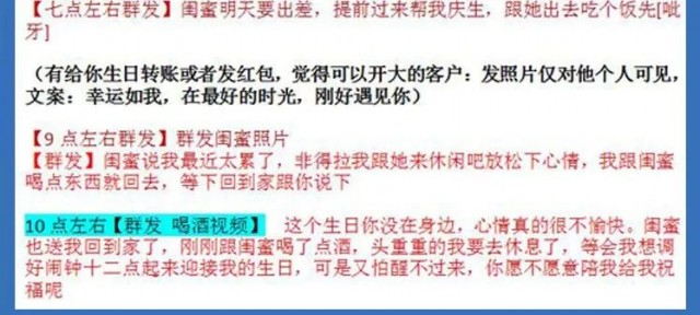 晚上,骗子群发和闺蜜吃饭的消息和朋友圈,晚上10点,继续群发喝酒的视频,并表示没有受骗者在身边很不愉快,并希望能最早得到受骗者的生日祝福。
