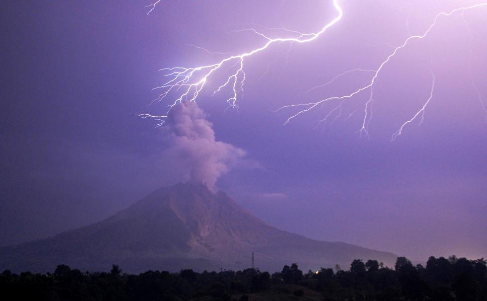 这是3月5日在印度尼西亚北苏门答腊省拍摄的锡纳朋火山上空的闪电。(新华社发,森比林摄)
