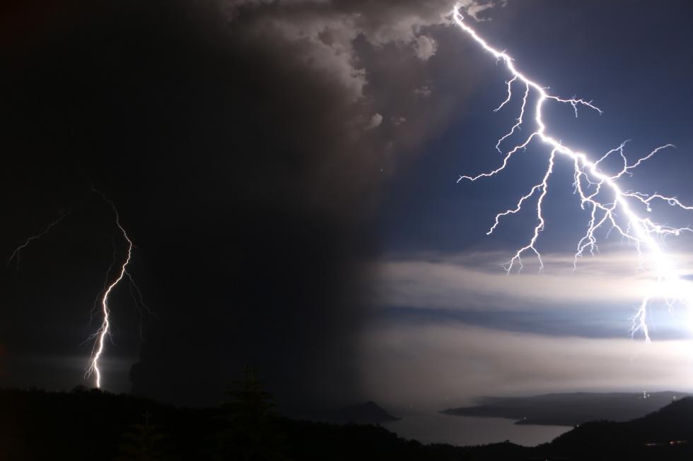 2020年1月12日,在菲律宾塔盖泰,闪电伴随着塔阿尔火山喷出的火山灰,在天空中呈现出壮观景象。(新华社发,乌马利摄)