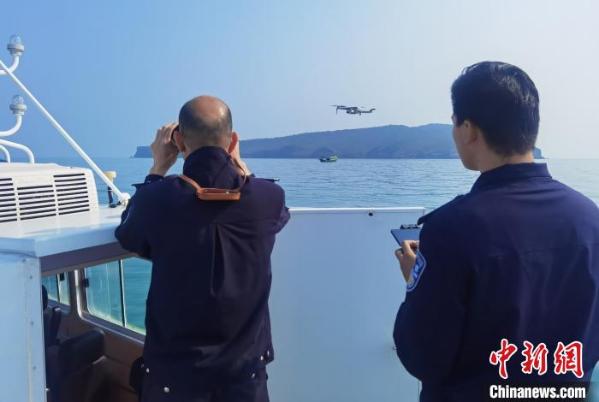 图为民警利用望远镜、无人机等设备进行海上巡查。 黎力彬 摄