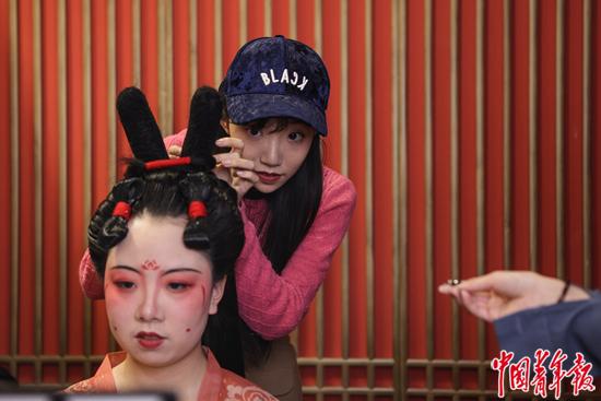 3月9日,北京三里屯,韩爽(左二)在自己的汉服体验馆里录制《唐宫夜宴》仿妆教程视频。《唐宫夜宴》是今年河南卫视春晚的舞蹈节目,播出后引发热议。韩爽与同事经常把汉服造型过程录下来发到网上,宣传汉服文化。 中青报·中青网记者 曲俊燕/摄
